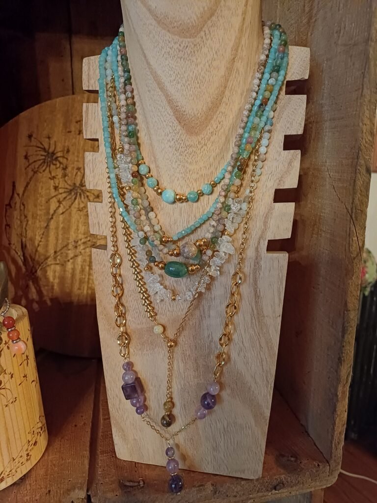 Les pièces sont fabriquées à partir de pierres naturelles choisies avec soin, les apprêts sont en acier inoxydable, or laminé ou argent.