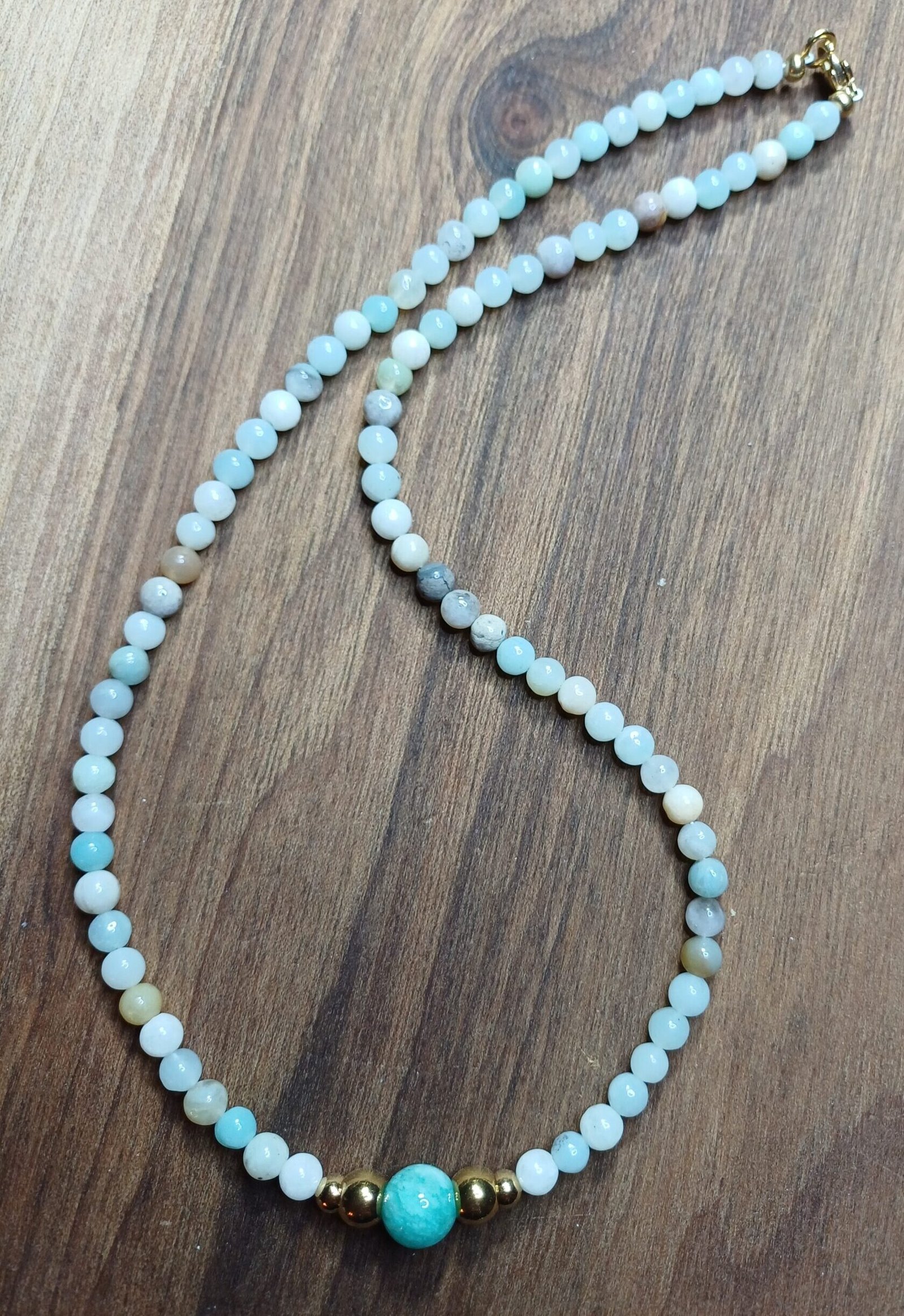 Le collier d’Amazonite en perles de 4mm et acier inoxydable doré incarne la perfection, combinant le charme naturel des pierres semi-précieuses avec une finition premium en métal doré. Ce bijou est conçu pour sublimer votre tenue tout en ajoutant une touche d’élégance à votre style quotidien ou à des occasions spéciales.
